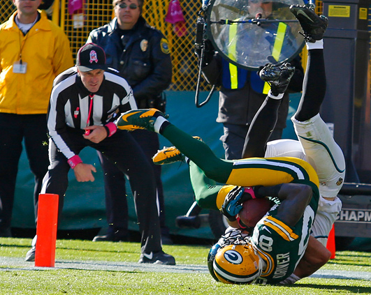 Green Bay Packers wide receiver James Jones runs over Arizona Cardinals cornerback Jamell Fleming to score a touchdown.