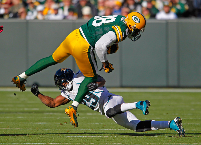 Green Bay Packers running back Alex Green is hit during a run by Jacksonville Jaguars outside linebacker Russell Allen.