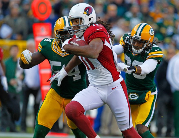 Arizona Cardinals wide receiver Larry Fitzgerald runs after making a catch while being covered by Green Bay Packers linebacker Dezman Moses (54) and cornerback Tramon Williams (38).