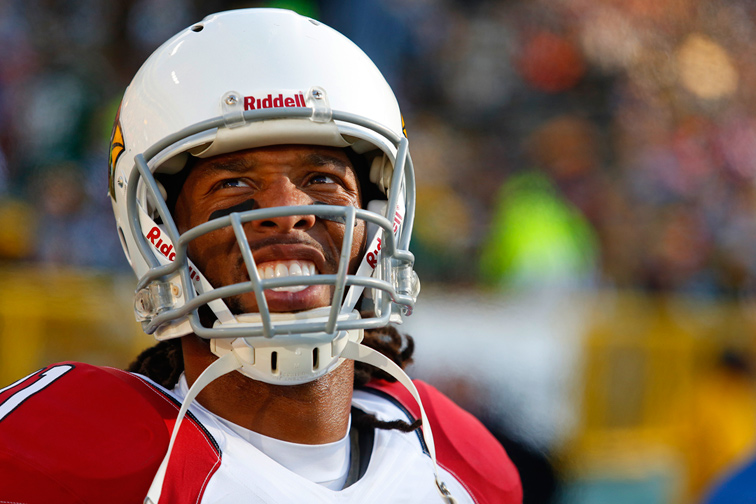 Arizona Cardinals wide receiver Larry Fitzgerald is seen on the sidelines during an NFL football game against the Green Bay Packers.