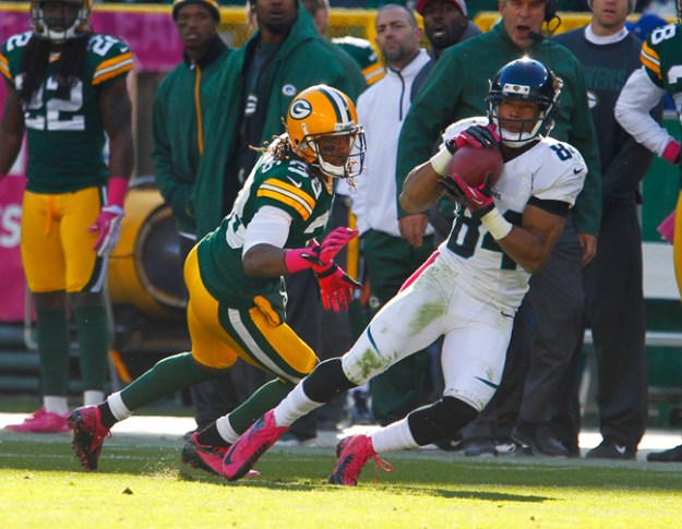 Jacksonville Jaguars wide receiver Cecil Shorts catches a pass while being covered by Green Bay Packers cornerback Tramon Williams.