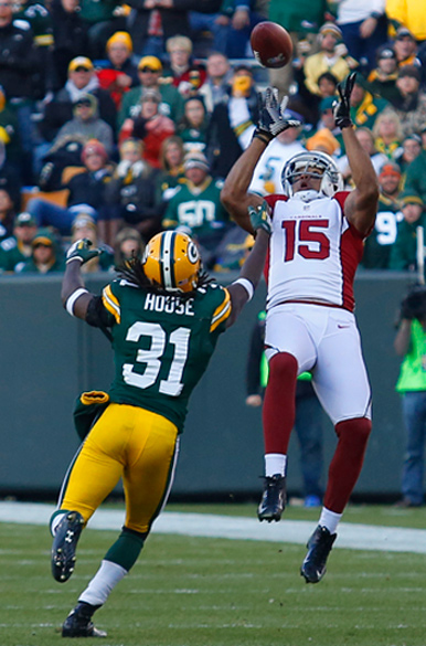 Arizona Cardinals wide receiver Michael Floyd leaps to make a catch while being covered by Green Bay Packers cornerback Davon House.