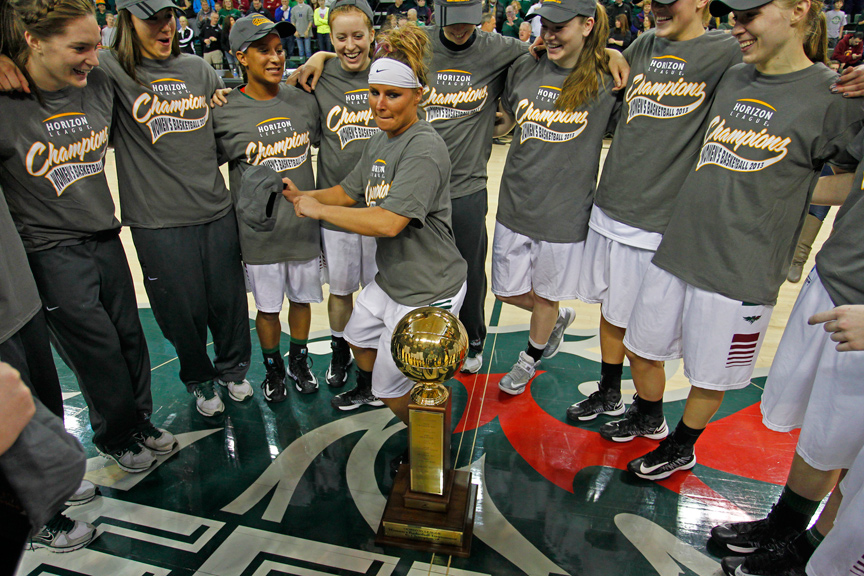 Green Bay players celebrate their win over Loyola in the Horizon League Women’s Basketball Championship game.