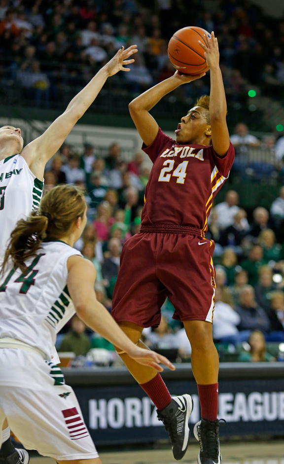 Loyola’s Ayrealle Beavers shoot over Wisconsin-Green Bay’s Adrian Ritchie during the first half of the Horizon League Women’s Basketball Championship game.