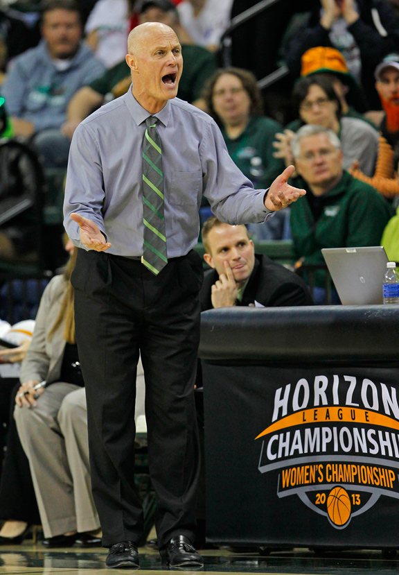 Green Bay’s head coach Kevin Borseth reacts to a jump ball call made by officials during the first half of the Horizon League Women’s Basketball Championship game against Loyola.