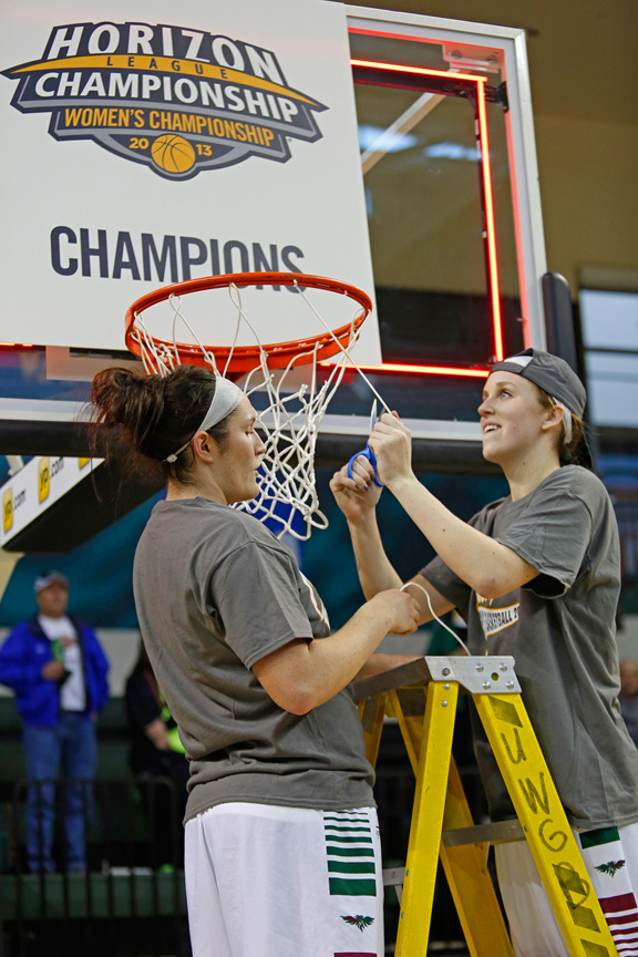 Green Bay’s Sarah Eichler left and Adrian Ritchie cut down the nets celebrating their win over Loyola in the Horizon League Women’s Basketball Championship game.