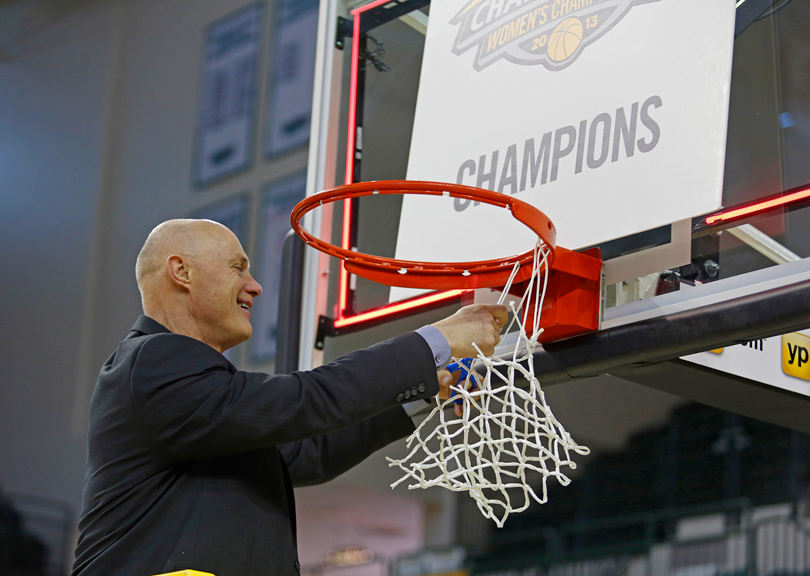 Green Bay’s head coach Kevin Borseth cuts down the net celebrating Green Bay’s win over Loyola in the Horizon League Women’s Basketball Championship game.
