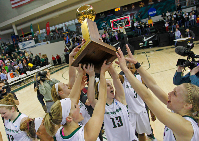 Green Bay’s Sam Zastrow dances around the championship trophy with teammates, celebrating their win over Loyola in the Horizon League Women’s Basketball Championship game.