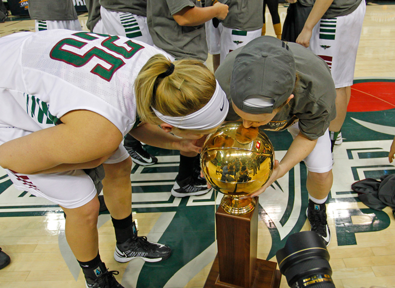 Green Bay’s Jenny Gilbertson left and Adrian Ritchie kiss the championship trophy celebrating their win over Loyola in the Horizon League Women’s Basketball Championship game.