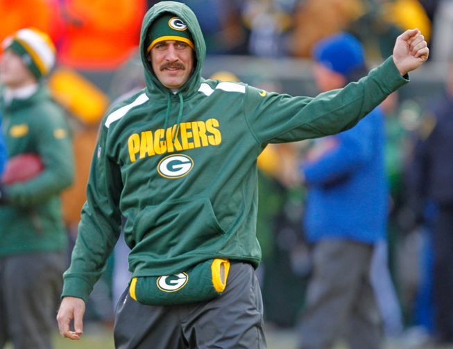 Green Bay Packers quarterback Aaron Rodgers stretches his arm during warm ups.