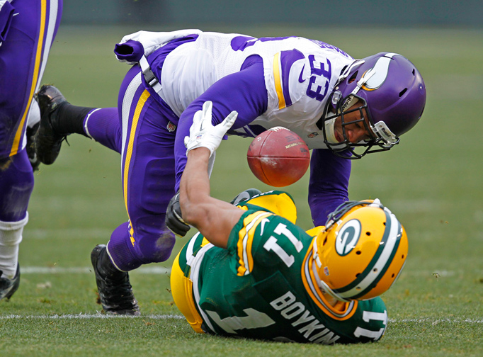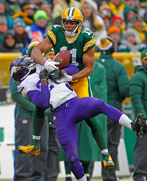 Green Bay Packers wide receiver James Jones is hit after making a catch by Minnesota Vikings cornerback Xavier Rhodes.