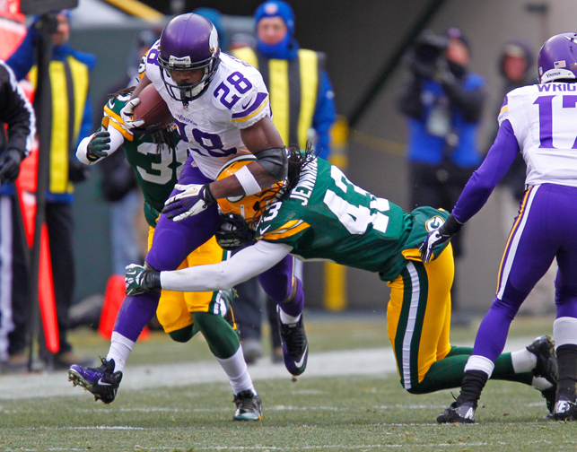 Minnesota Vikings running back Adrian Peterson is hit during a run by Green Bay Packers free safety M.D. Jennings (43) and cornerback Tramon Williams (38).