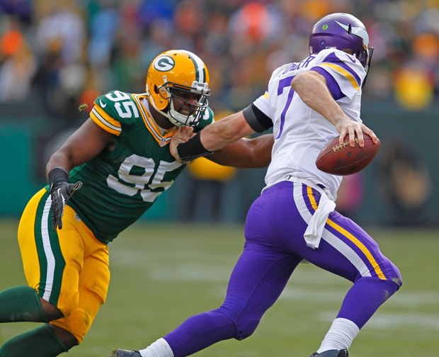Green Bay Packers defensive end Datone Jones tries to get his hands on Minnesota Vikings quarterback Christian Ponder.