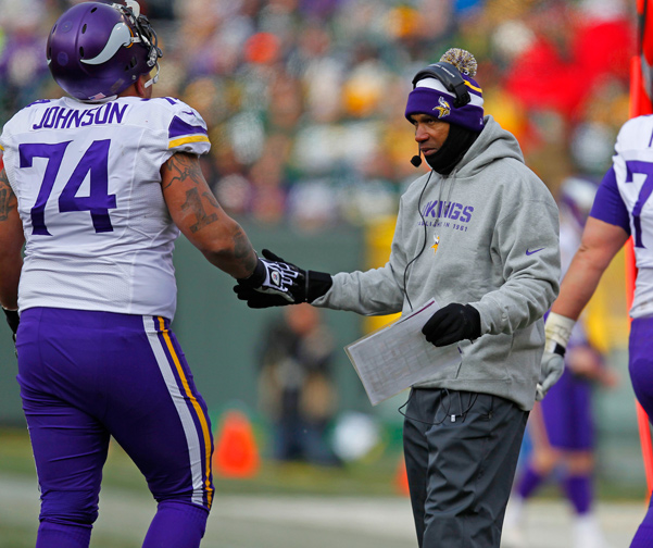 Minnesota Vikings head coach Leslie Frazier slaps hands with guard Charlie Johnson during an NFL football game against the Green Bay Packers.