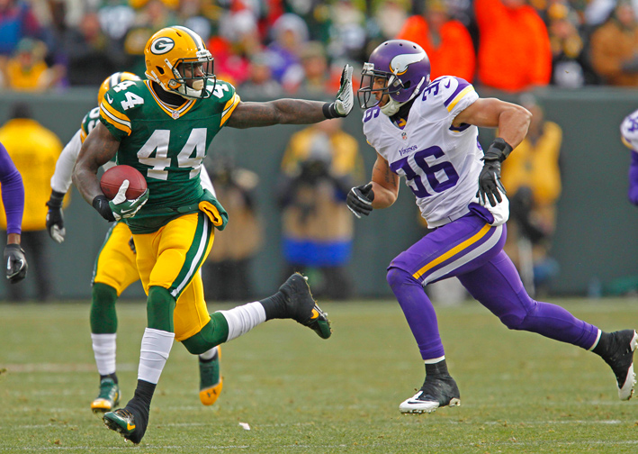 Green Bay Packers running back James Starks stiff arms Minnesota Vikings safety Robert Blanton.