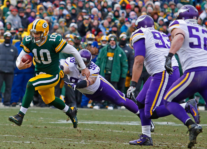 Green Bay Packers quarterback Scott Tolzien dodges Minnesota Vikings defensive end Brian Robison.