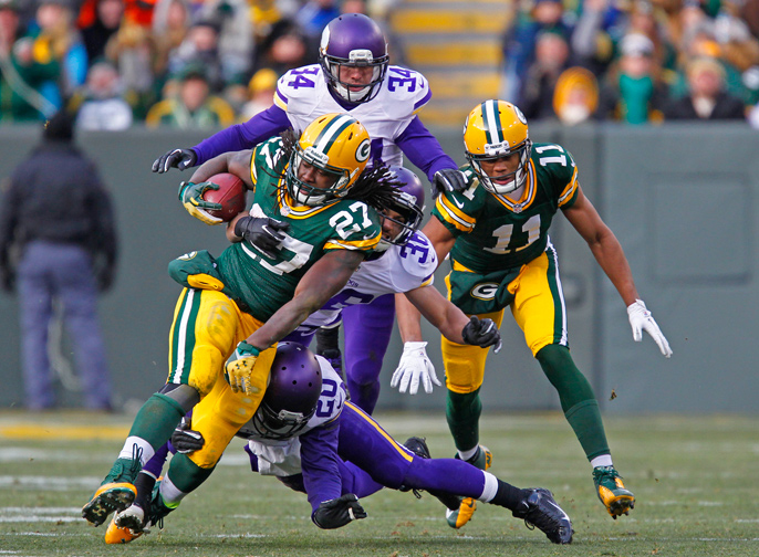 Green Bay Packers running back Eddie Lacy (27) is hit during a run by Minnesota Vikings cornerback Chris Cook (20) and Robert Blanton (36).