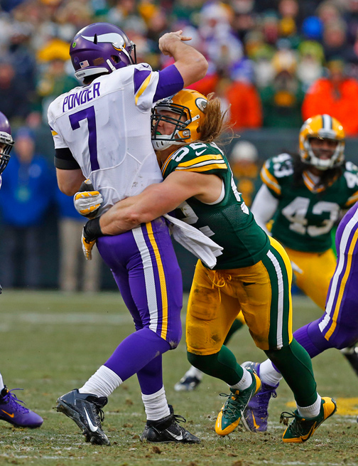Green Bay Packers outside linebacker Clay Matthews sacks Minnesota Vikings quarterback Christian Ponder.